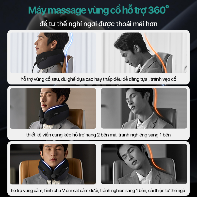 Máy massage cổ Philips được trang bị thiết kế hình chữ U 360° có khả năng ôm sát cổ người dùng với các đường cong được phân vùng một cách khoa học để nâng cằm, sau gáy và 2 bên má. Đồng thời không bị đè ép lên vành tai trái và phải, giúp người dùng có tư thế nghỉ ngơi thoải mái và phù hợp nhất.