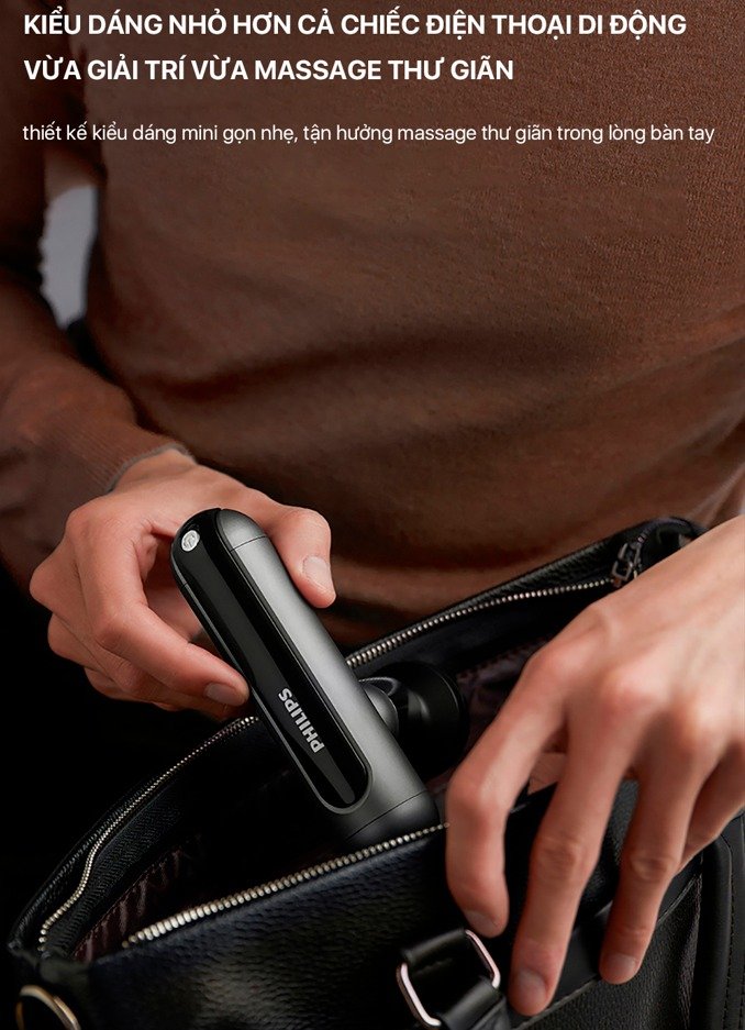 Súng massage mini PHILIPS PPM7303 được trang bị thiết kế nhỏ gọn với trọng lượng chỉ 300g. Máy sở hữu thiết kế hình chữ “T” cực kỳ dễ dàng để người dùng cầm nắm và thực hiện các thao tác massage trên các khu vực cơ khác nhau. Phần tay cầm của máy được phủ lớp sơn kim loại bền bỉ và tay cầm siêu mỏng chỉ 36mm. Từ đó nâng cao trải nghiệm cầm máy của người dùng một cách chắc chắn hơn. Ngoài ra với kích thước chỉ 75 x 38 x 153mm thì người dùng cũng có thể dễ dàng mang máy theo ở trong túi và phục vụ nhiều mục đích sử dụng khác nhau.