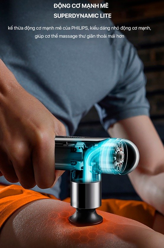 Để phục vụ được nhu cầu massage chuyên sâu của người dùng thì súng massage cầm tay Philips được nhà sản xuất trang bị hệ thống truyền động hoàn toàn bằng kim loại Super Dynamic. Có thể cho công suất đầu ra lên đến 5kg và khả năng tác động các mô sâu đến 6mm. Từ đó mà máy có thể dễ dàng loại bỏ các cơn đau nhức cơ một cách hiệu quả và nhanh chóng.