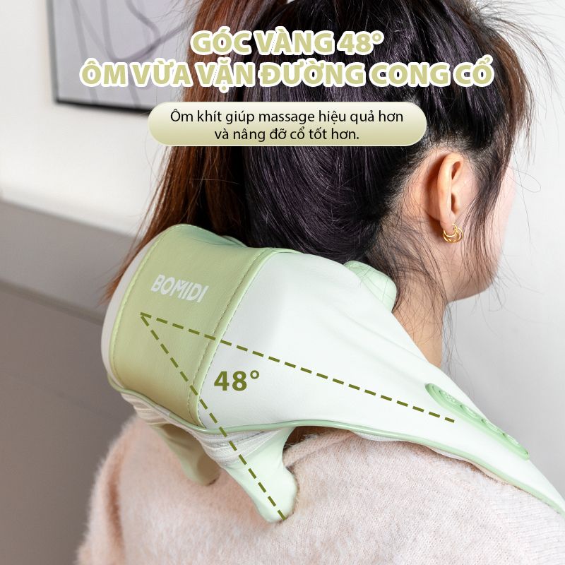 Với thiết kế góc nghiêng 48°, Bomidi MP2 LITE dễ dàng ôm sát theo đường cong tự nhiên của vùng vai và cổ, giúp các điểm tiếp xúc áp sát bề mặt cơ thể và hoạt động hiệu quả hơn. Cấu trúc này đặc biệt phù hợp với thói quen sinh hoạt hiện đại, khi phần lớn thời gian được dành cho việc ngồi làm việc, sử dụng máy tính hoặc thiết bị di động. Góc nghiêng cho phép các đầu massage tác động sâu vào vùng cổ gáy và vai – khu vực thường xuyên chịu áp lực do sai tư thế. Bên cạnh đó, thiết kế nghiêng giúp thiết bị cố định chắc chắn, hạn chế trượt lệch khi thay đổi tư thế, từ đó duy trì lực massage đều đặn, hỗ trợ thư giãn cơ bắp hiệu quả hơn.