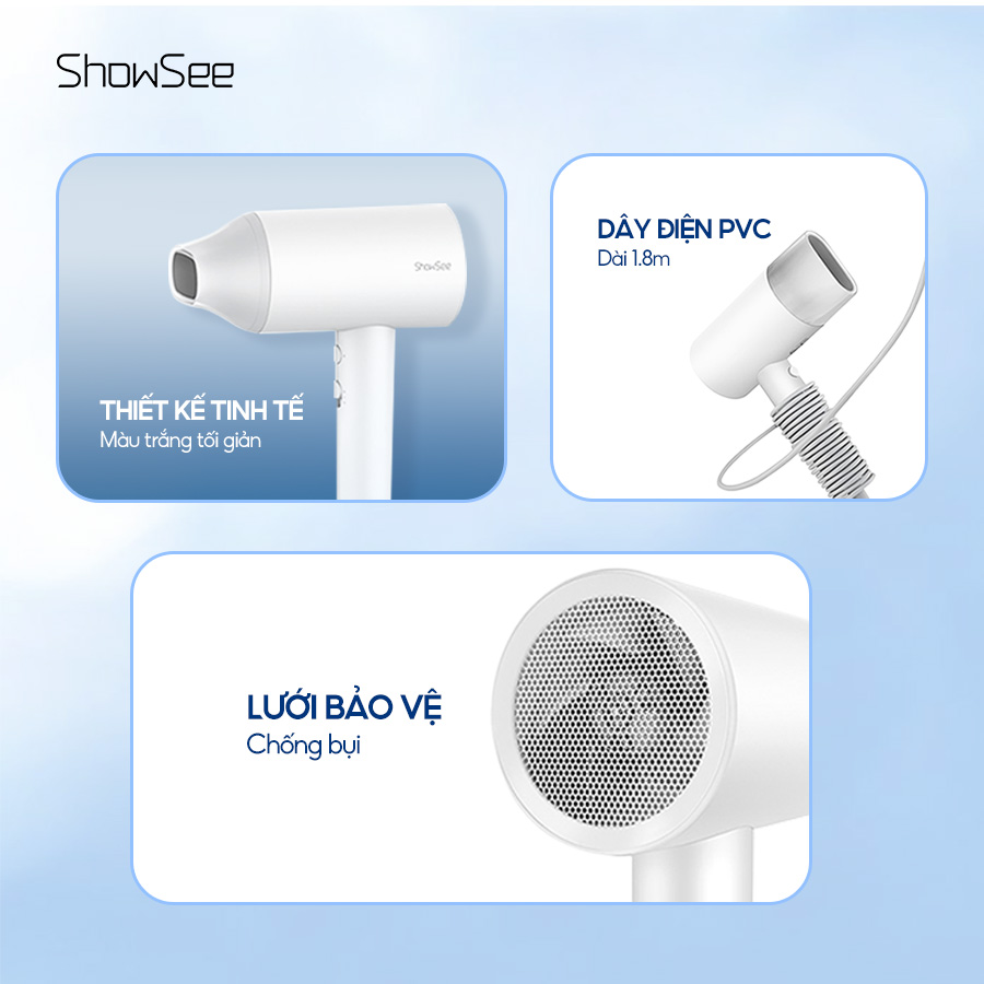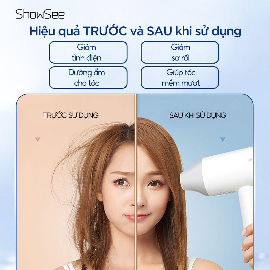 Máy sấy Showsee tích hợp công nghệ chăm sóc tóc chuyên sâu với mật độ ion âm lên đến 20 triệu đơn vị trên mỗi cm³. Trong quá trình vận hành, các hạt ion này nhanh chóng trung hòa điện tích, ngăn chặn tình trạng tóc xơ rối hoặc gãy rụng do nhiệt. Nhờ cơ chế khóa ẩm thông minh, mái tóc luôn giữ được vẻ bóng mượt và độ đàn hồi tự nhiên sau mỗi lần sử dụng.