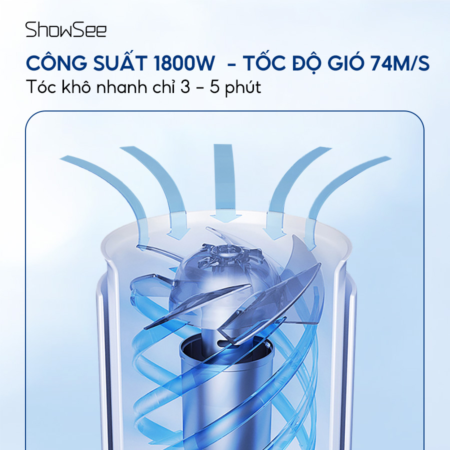 Showsee A1-W / A1-EUW hoạt động với công suất mạnh mẽ 1800W, kết hợp cùng tốc độ gió cao lên tới 74 m/s, tạo ra luồng khí ổn định và mạnh mẽ trong suốt quá trình sử dụng. Nhờ đó, mái tóc có thể được làm khô nhanh chóng chỉ trong khoảng 3 - 5 phút, giúp tiết kiệm đáng kể thời gian sấy mỗi ngày. Sự kết hợp giữa công suất lớn và luồng gió mạnh còn góp phần nâng cao hiệu quả làm khô tóc, mang lại trải nghiệm sử dụng tiện lợi và nhanh chóng hơn cho người dùng.
