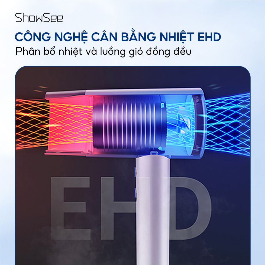 Máy sấy tóc Showsee được trang bị cơ chế cân bằng nhiệt EHD hiện đại, giúp kiểm soát và phân bổ nhiệt lượng đồng đều trong suốt quá trình hoạt động. Nhờ đó, luồng nhiệt luôn được duy trì ổn định, hỗ trợ làm khô tóc nhanh chóng mà không gây hiện tượng quá nóng tại một vị trí. Công nghệ này không chỉ giúp nâng cao hiệu quả sấy mà còn góp phần hạn chế tác động nhiệt lên tóc, mang lại cảm giác an tâm và thoải mái hơn khi sử dụng.
