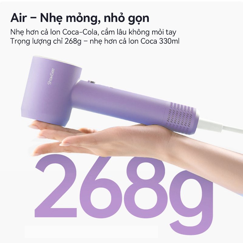 Máy sấy tóc Showsee gây ấn tượng với trọng lượng siêu nhẹ chỉ 268g. Nhờ vậy, người dùng có thể thoải mái cầm nắm và sử dụng trong thời gian dài mà không lo mỏi tay. Phần thân máy được chế tác từ nhựa cao cấp bền bỉ, vừa đảm bảo độ chắc chắn, vừa duy trì được sự gọn nhẹ. Đi kèm theo đó là đầu sấy chuyên dụng, có thể dễ dàng tháo lắp, giúp bạn linh hoạt thay đổi chế độ sấy theo nhu cầu từ làm khô nhanh cho đến tạo kiểu.