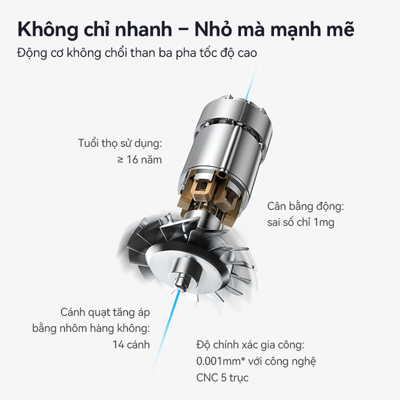 Máy sấy Showsee A15-V trang bị động cơ không chổi than Air Turbo hiện đại, hoạt động với tốc độ cực cao lên tới 110.000 vòng/phút, tạo ra luồng gió mạnh mẽ 75m/s giúp tóc khô nhanh chóng chỉ trong thời gian ngắn. Bên cạnh đó, hệ thống 14 cánh quạt tăng áp được thiết kế tối ưu giúp nâng cao hiệu suất sấy, đảm bảo luồng gió ổn định và mạnh mẽ hơn so với máy sấy thông thường. Máy sấy tóc Showsee còn được đánh giá cao về độ bền bỉ, có thể đồng hành cùng bạn lên đến hơn 16 năm sử dụng, trở thành một lựa chọn đáng tin cậy cho mọi gia đình.