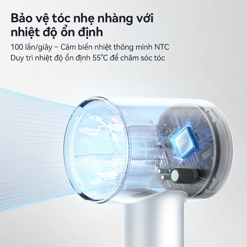 Máy sấy Showsee sở hữu cảm biến NTC thông minh, có khả năng tự động duy trì mức nhiệt ổn định ở 55°C (hiển thị bằng màu cam). Đây là mức nhiệt lý tưởng, vừa đủ để giúp tóc khô nhanh chóng mà không gây ra tình trạng khô xơ hay cháy hỏng do nhiệt độ quá cao. Nhờ cơ chế kiểm soát nhiệt chính xác này, mái tóc luôn được bảo vệ tối ưu, hạn chế tối đa tác động tiêu cực từ nhiệt, đồng thời vẫn giữ lại độ ẩm tự nhiên bên trong sợi tóc.