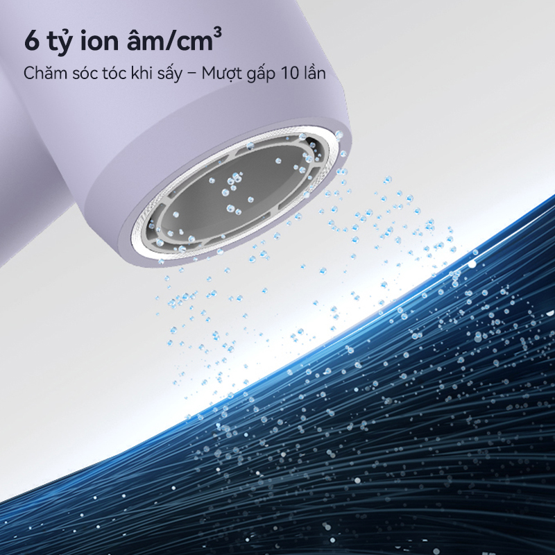 Showsee A15-V sử dụng công nghệ giải phóng ion âm tiên tiến với mật độ cực cao, lên tới 6 tỷ ion/cm³. Nhờ đó, các hạt ion âm sẽ nhanh chóng trung hòa điện tích tĩnh điện, giảm thiểu tình trạng tóc bị xơ rối hay gãy rụng trong quá trình sấy. Không chỉ vậy, ion âm còn đóng vai trò như một lớp “lá chắn dưỡng ẩm tự nhiên”, giúp khóa chặt độ ẩm bên trong từng sợi tóc, từ đó giữ cho mái tóc luôn mềm mại, bóng mượt và dễ vào nếp hơn sau mỗi lần sử dụng.