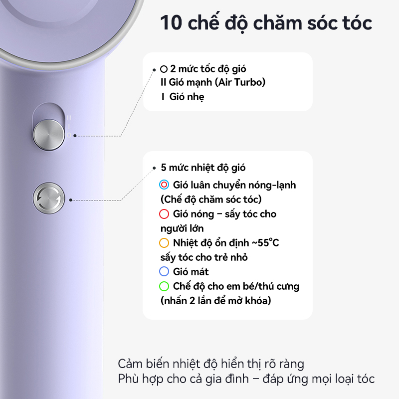 Máy sấy A15-V được thiết kế với 2 cấp độ gió linh hoạt cùng 5 mức nhiệt chuyên biệt, đáp ứng đa dạng nhu cầu từ sấy tạo kiểu đến chăm sóc tóc hằng ngày. Đặc biệt, máy sở hữu chế độ sấy nóng - lạnh song song, giúp tóc khô nhanh nhưng vẫn giữ được độ ẩm tự nhiên, đồng thời có cả chế độ sấy an toàn dành riêng cho trẻ em, trẻ sơ sinh hoặc thú cưng, đảm bảo sự dịu nhẹ và an toàn tuyệt đối khi sử dụng. Điểm nổi bật của máy sấy Showsee A15-V chính là hệ thống đèn LED hiển thị bằng màu sắc tương ứng với từng mức nhiệt. Nhờ vậy, bạn có thể dễ dàng nhận biết và điều chỉnh chế độ phù hợp chỉ bằng một cái nhìn, mang lại sự tiện lợi tối đa trong quá trình trải nghiệm.