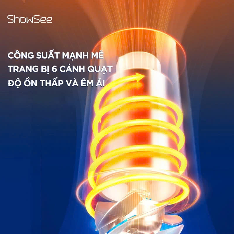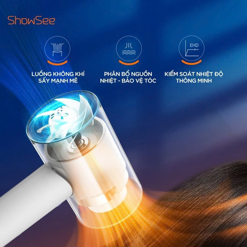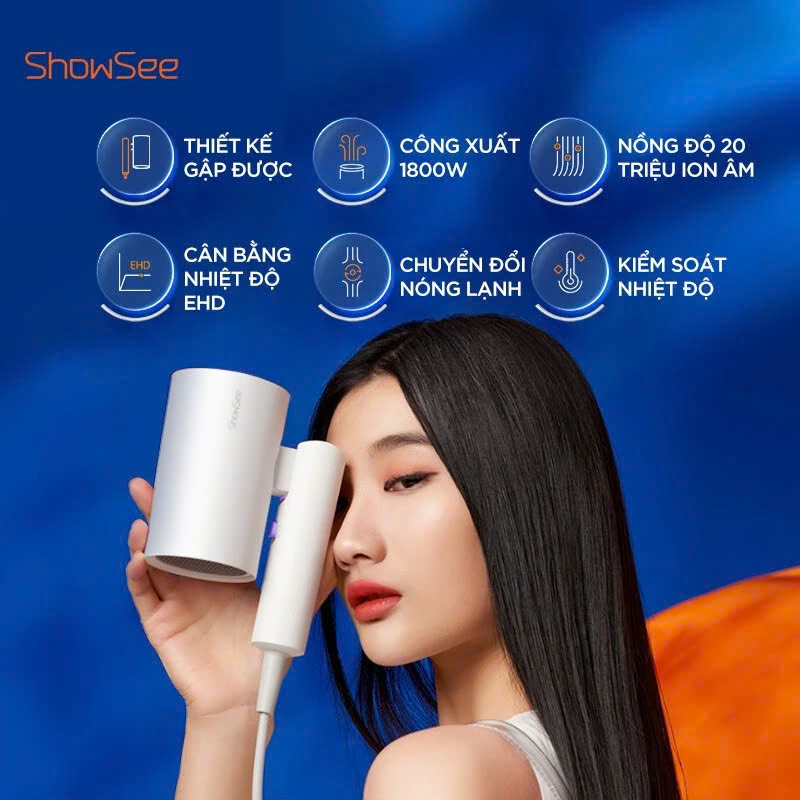 Trong quá trình hoạt động, máy sấy tóc Showsee có thể tạo ra tới 20 triệu ion âm trên mỗi cm³, góp phần trung hòa tĩnh điện thường xuất hiện khi sấy tóc. Công nghệ này giúp giữ lại độ ẩm tự nhiên của sợi tóc, hỗ trợ bảo vệ cấu trúc tóc trước tác động của nhiệt. Nhờ vậy, mái tóc sau khi sấy trở nên suôn mượt, mềm mại hơn và giảm thiểu tình trạng khô rối hay xơ cứng.