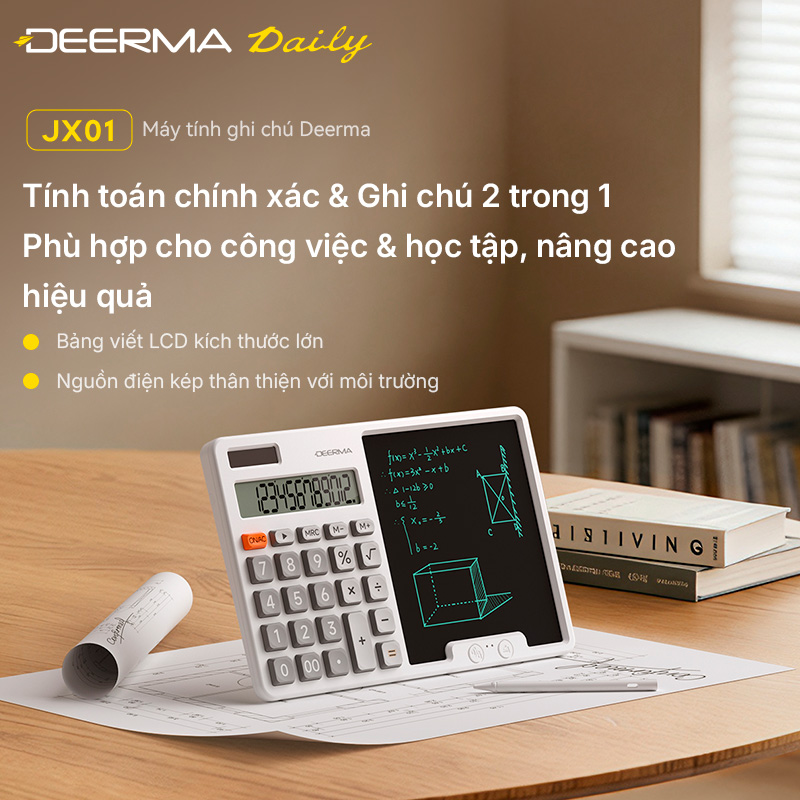 Deerma JX01 mang đến trải nghiệm làm việc hiện đại khi tích hợp trọn vẹn cả chức năng tính toán lẫn ghi chú vào trong một thiết kế duy nhất. Với màn hình LED hiển thị con số rõ ràng cùng hệ thống bàn phím thao tác nhanh, người dùng dễ dàng thực hiện các phép tính phức tạp. Song song đó, bảng LCD đi kèm hai bút stylus tạo không gian lưu trữ ý tưởng hoặc nhắc nhở công việc ngay tức thì. Đây chính là lựa chọn tối ưu, gói gọn mọi tiện ích cần thiết để tối giản hóa không gian bàn học hay văn phòng.