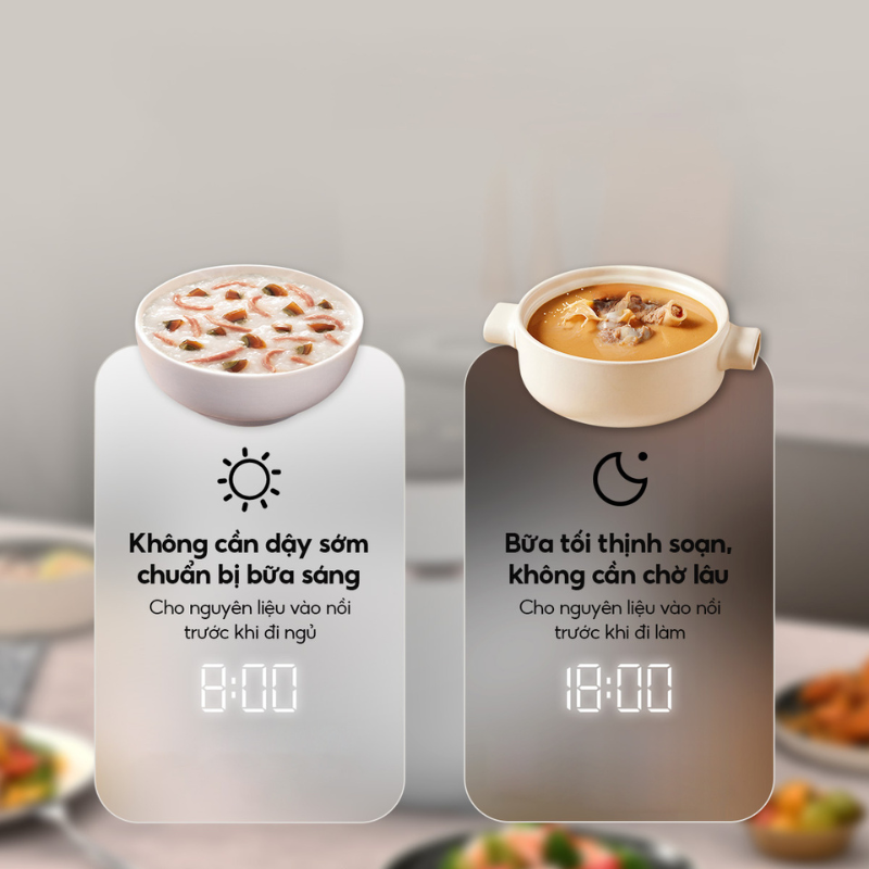 Nồi cơm cao tần cảm ứng AQUA tích hợp chế độ hẹn giờ nấu linh hoạt lên đến 24 tiếng, giúp bạn chủ động sắp xếp thời gian nấu nướng một cách tiện lợi. Chỉ cần cho nguyên liệu vào trước, cài đặt thời gian nấu cố định, và bạn sẽ có ngay bữa ăn thơm ngon, nóng hổi đúng giờ mà không cần chờ đợi hay canh chỉnh. Tính năng này đặc biệt hữu ích cho những người bận rộn, giúp tiết kiệm thời gian mà vẫn đảm bảo bữa ăn trọn vẹn dinh dưỡng.
