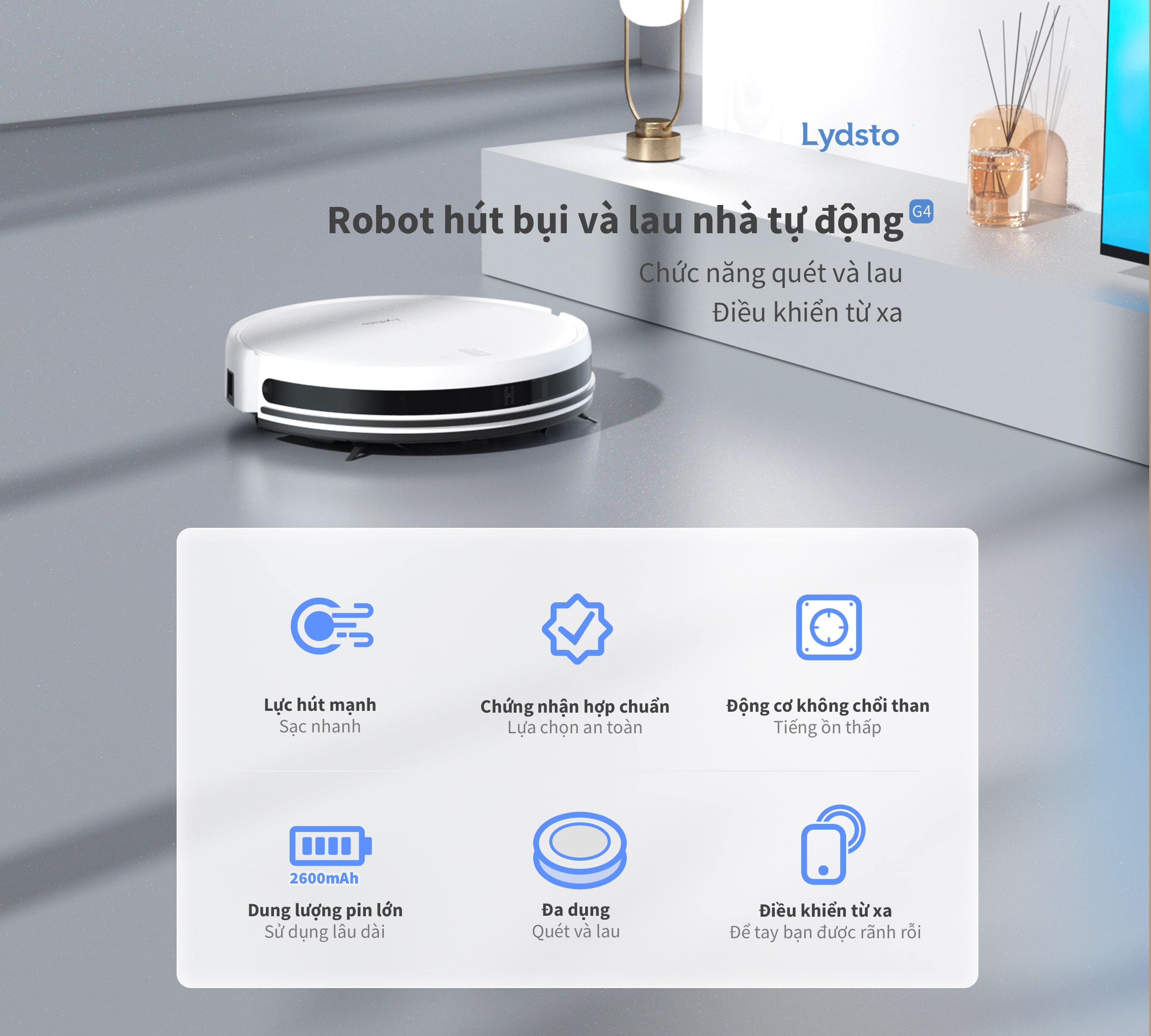Lydsto G4 là sản phẩm robot hút bụi lau nhà giá rẻ nằm trong hệ sinh thái Robot thông minh của Lydsto với thiết kế nhỏ gọn và lực hút mạnh lên đến 1600Pa, khả năng loại bỏ bụi bẩn ở mọi ngóc ngách cùng dung lượng pin lên đến 2600mAh cho thời lượng sử dụng lên đến 120 phút. Ngoài khả năng kết nối với app trên điện thoại thông minh, hãng còn trang bị thêm 1 remote điều khiển độc lập giúp việc vận hành Robot dễ dàng hơn. Với giá thành rẻ và các ưu điểm trên thì đây hứa hẹn sẽ là mẫu robot hút bụi lau nhà "quốc dân" mà bất cứ ai cũng nên cân nhắc sở hữu trong gia đình của mình.