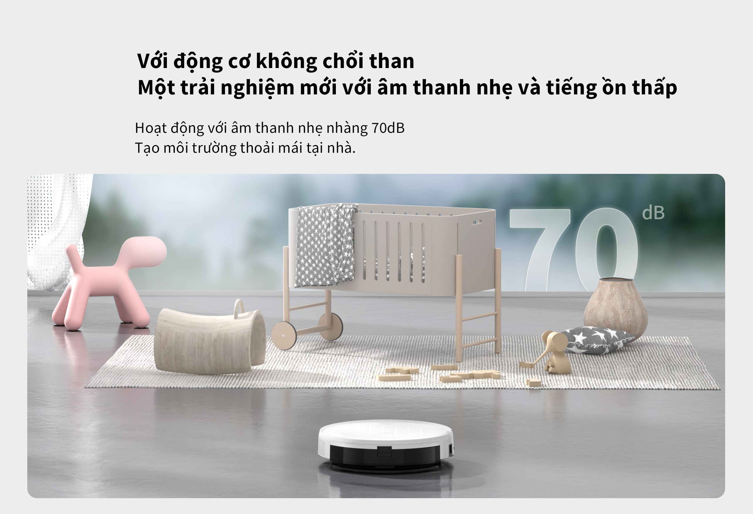 Bên cạnh đó, máy cũng hoạt động êm ái với độ ồn chỉ ở mức 70dB, giúp đem lại không gian yên tĩnh cho người dùng. Giúp bạn có thể sử dụng robot trong các không gian làm việc, phòng ngủ mà không làm phiền tới không gian sinh hoạt chung.