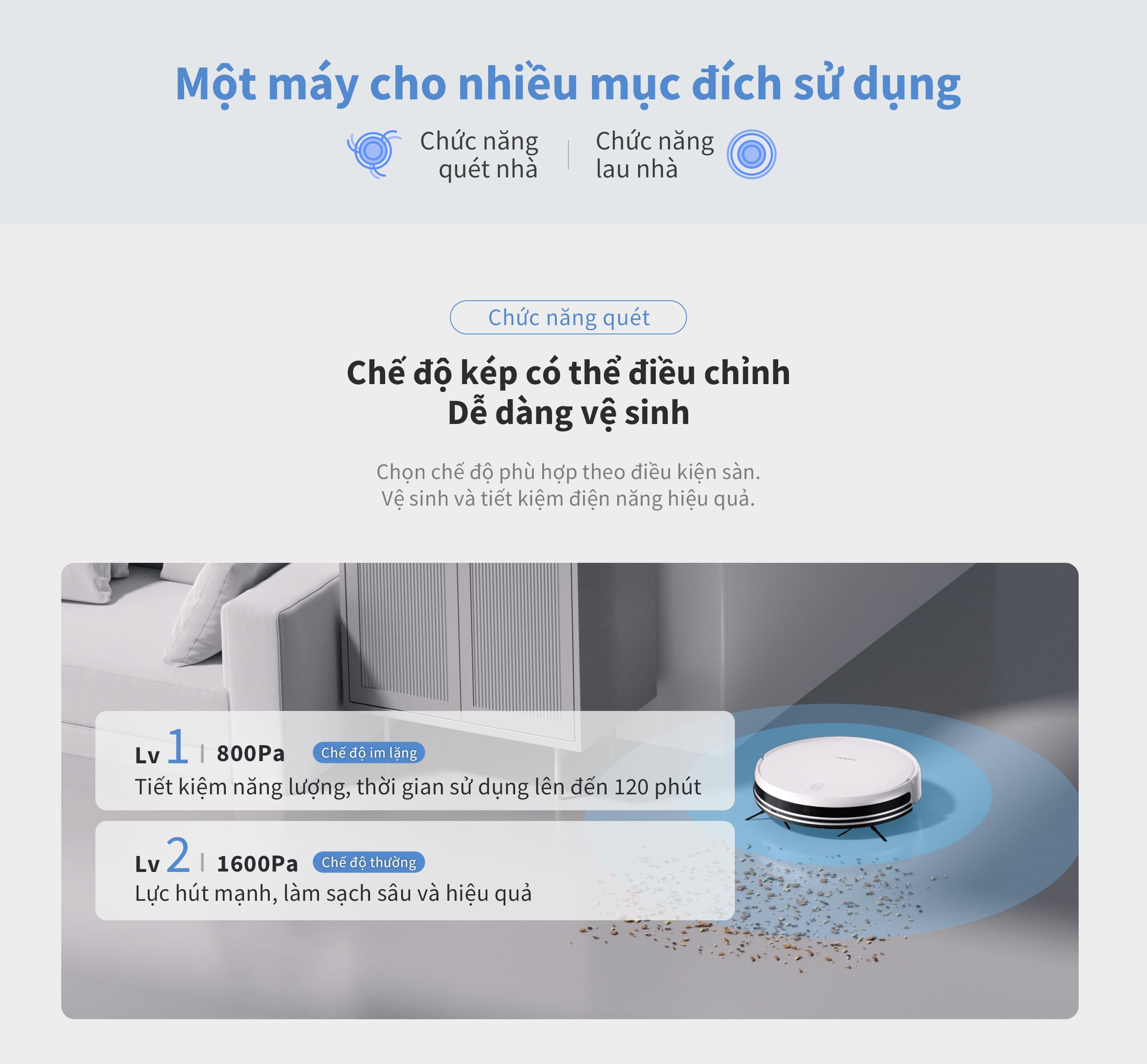 - Lực hút 1600Pa, trang bị 2 chế độ hút