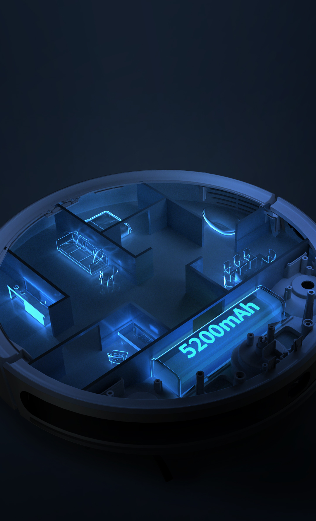 Viên pin dung lượng 5200mAh được trang bị trên thân máy có thể được sạc đầy chỉ khoảng 4 giờ, giúp cho robot hút bụi có thể hoạt động liên tục trong 150 phút, tương đương diện tích làm việc 150-200 m². Khi dung lượng pin yếu, robot sẽ tự động quay về dock sạc để tiếp thêm năng lượng và tự động quay lại vị trí cũ để tiếp tục hoàn thành công việc còn dở sau khi sạc đầy.