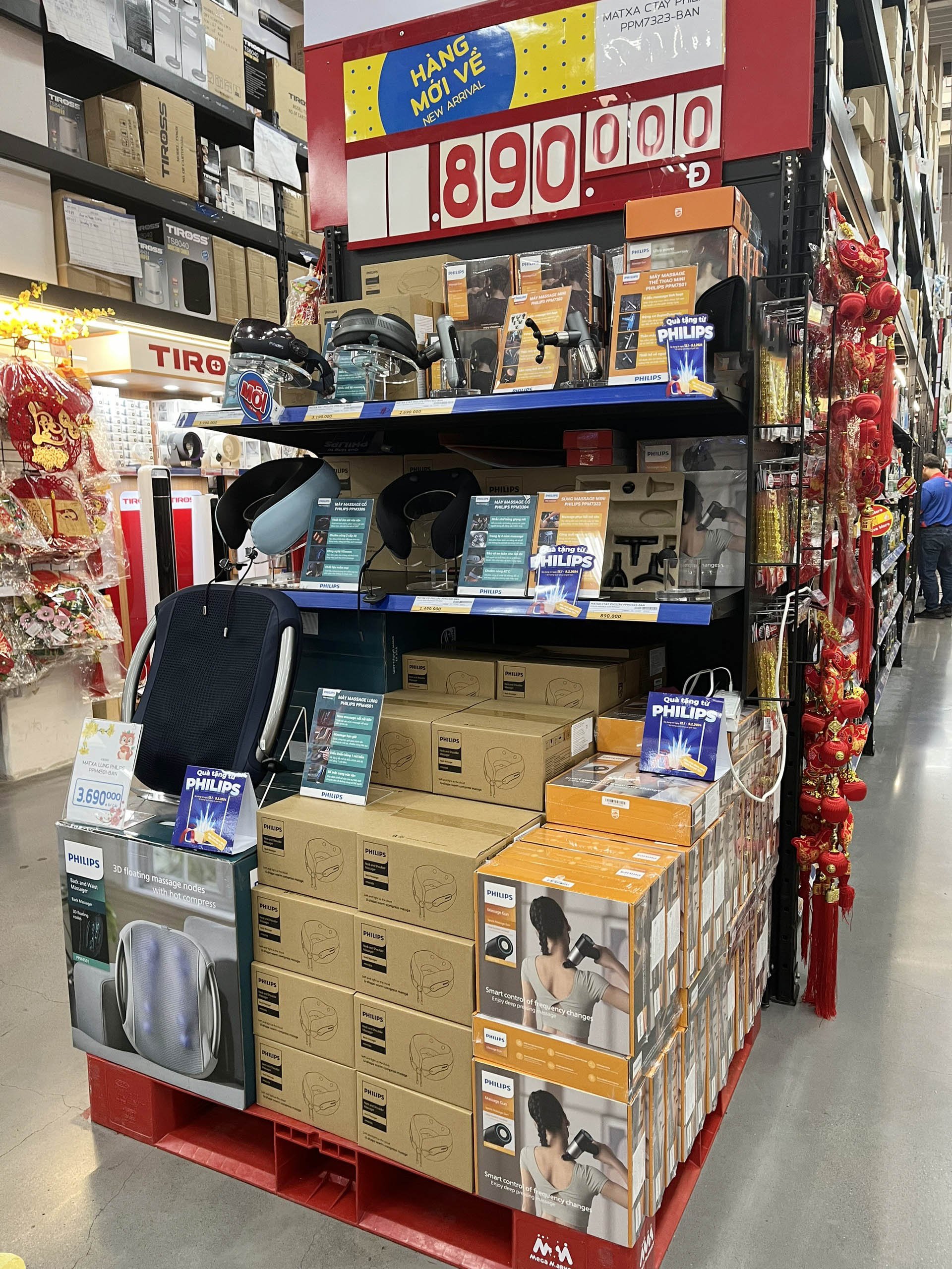 Khu vực trưng bày sản phẩm các thiết bị Massage Philips đa chủng loại, giúp khách hàng dễ dàng trải nghiệm và chọn lựa sản phẩm phù hợp