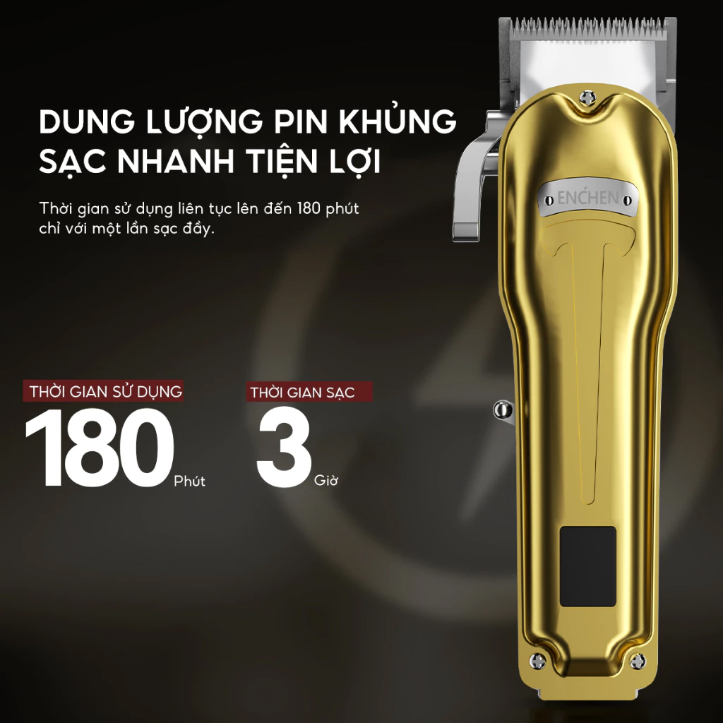 Boost 3 tích hợp viên pin dung lượng lớn 2000mAh, cho phép hoạt động liên tục lên đến 180 phút chỉ với một lần sạc - đủ để bạn thoải mái sử dụng trong nhiều lần cắt tóc mà không lo gián đoạn. Điểm cộng nổi bật là màn hình hiển thị thông minh, giúp bạn dễ dàng theo dõi dung lượng pin, nhận nhắc nhở tra dầu định kỳ và thông báo khi cần sạc. Enchen Boost 3 hỗ trợ sạc nhanh qua cổng Type-C hiện đại, vừa tiện lợi, vừa linh hoạt khi dùng chung được nhiều loại dây sạc. Đặc biệt, ngay cả khi pin yếu, bạn vẫn có thể sử dụng trực tiếp trong lúc cắm sạc, vô cùng tiện dụng trong quá trình cắt tỉa.